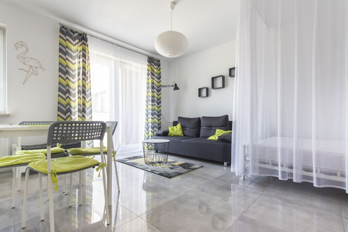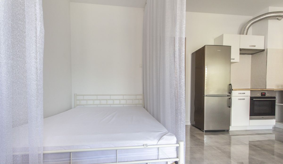 - Salonu z aneksem kuchennym z wydzielonym łóżkiem podwójnym